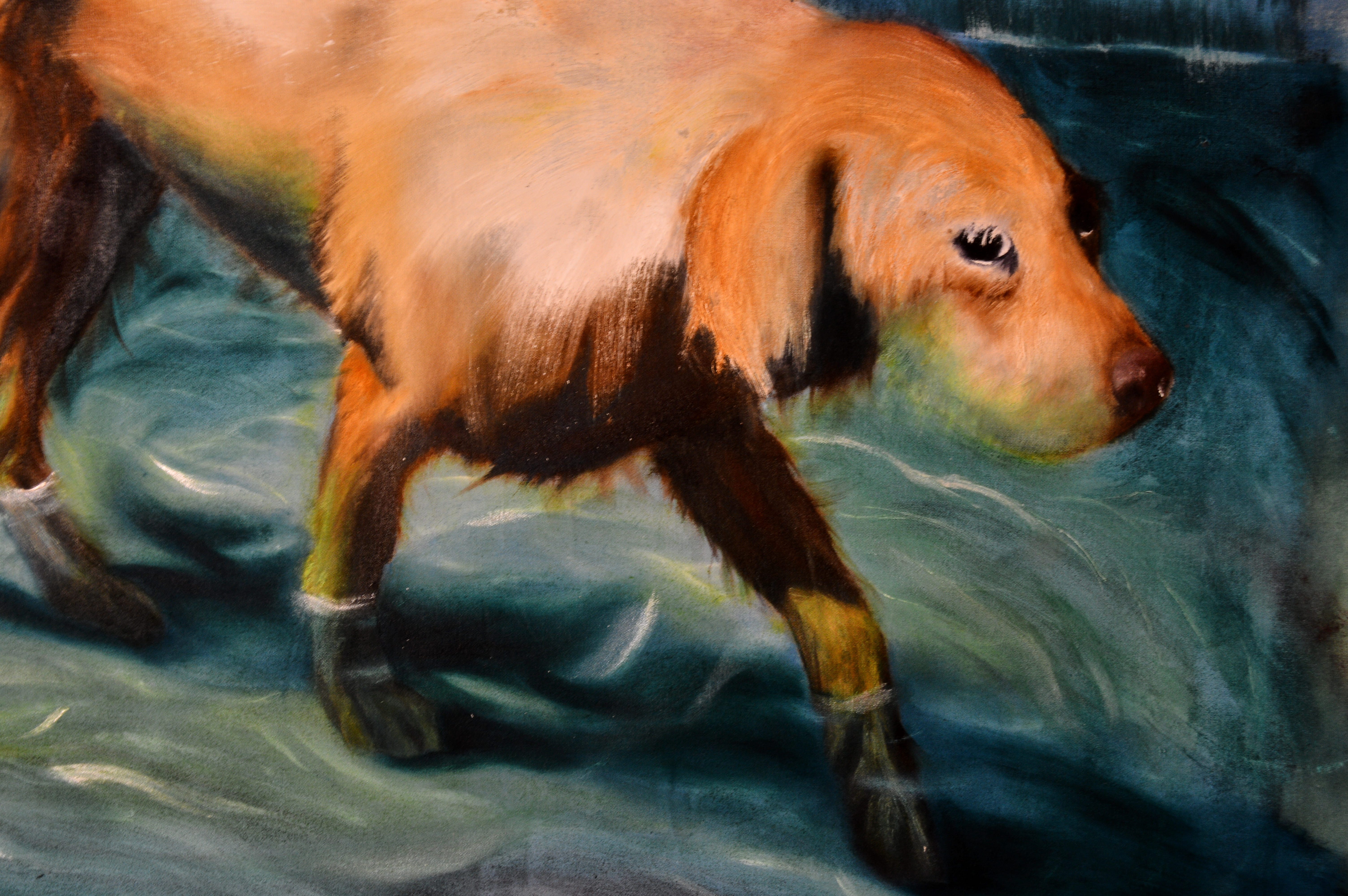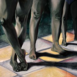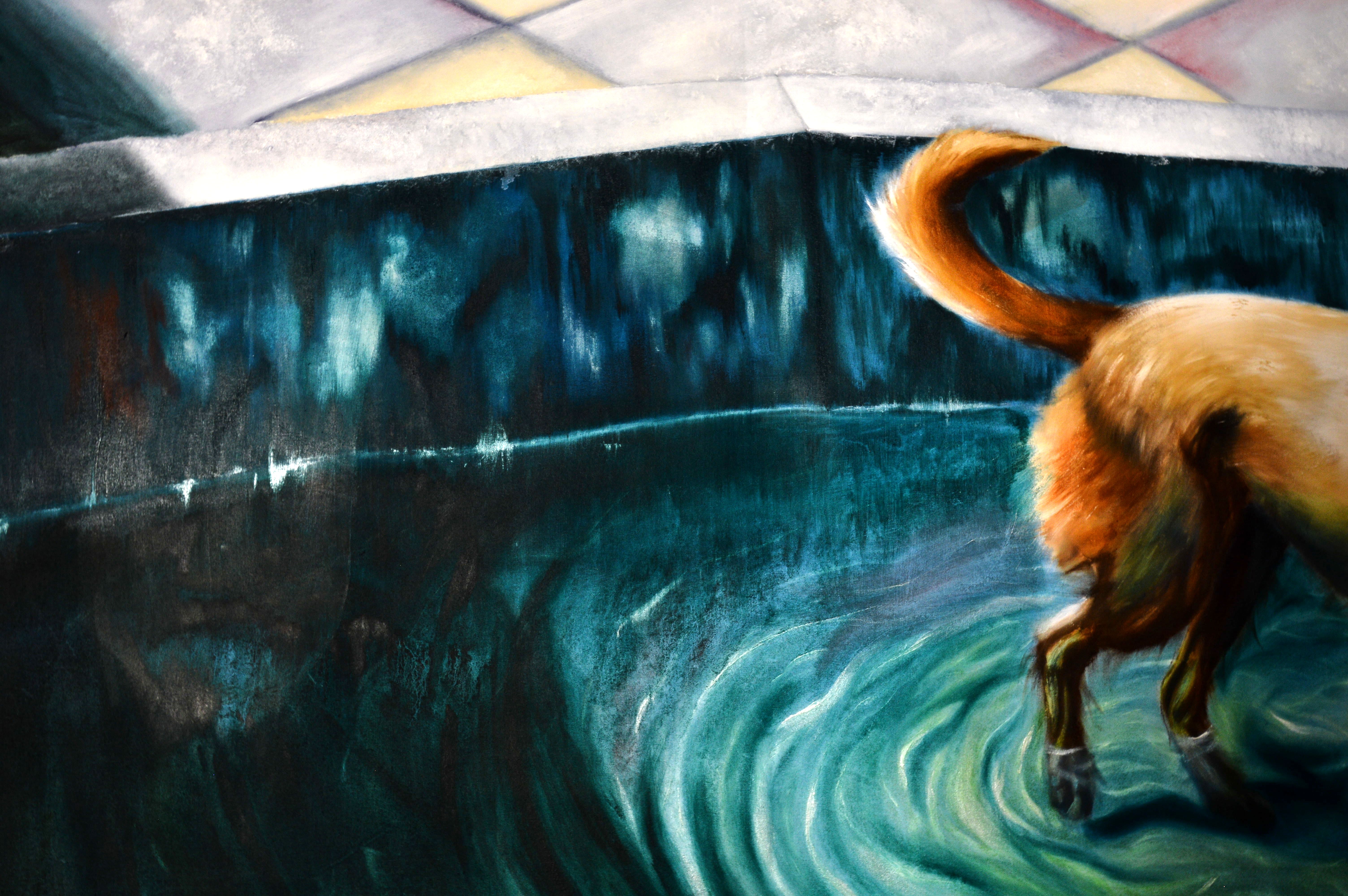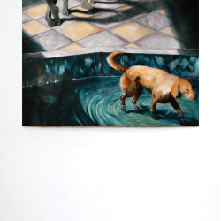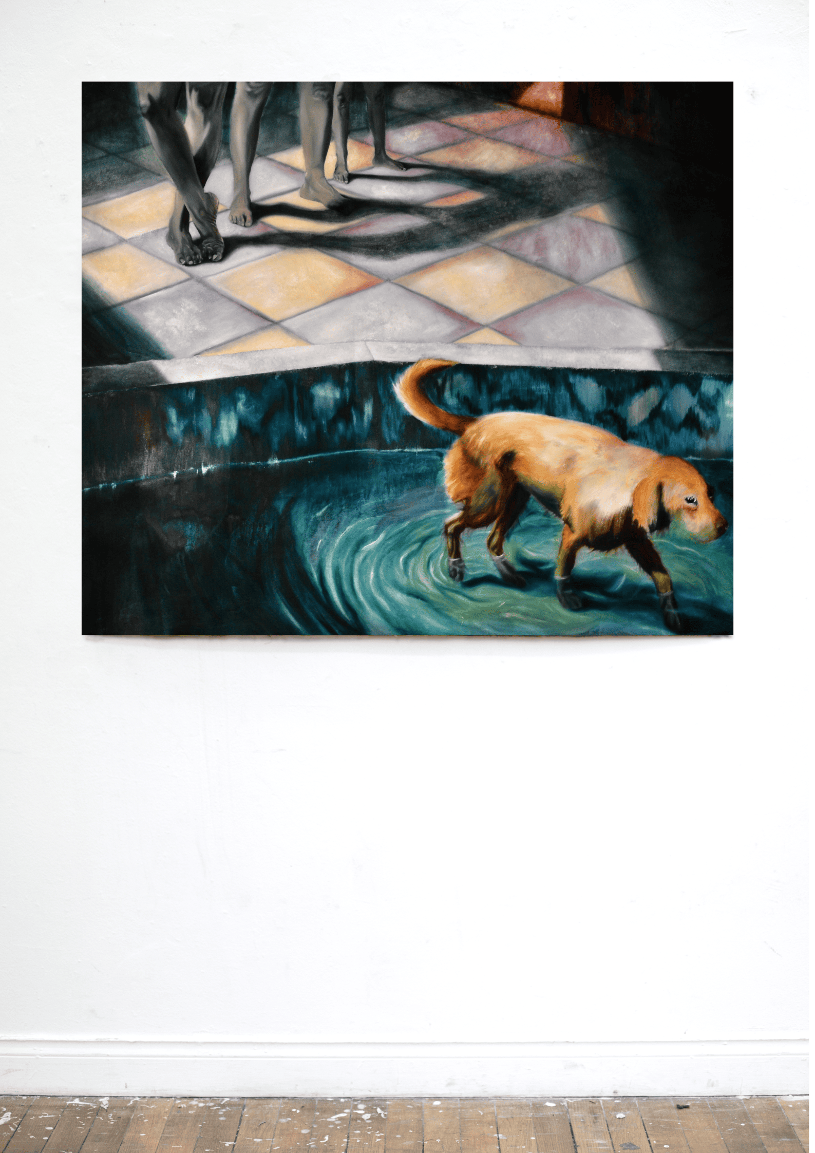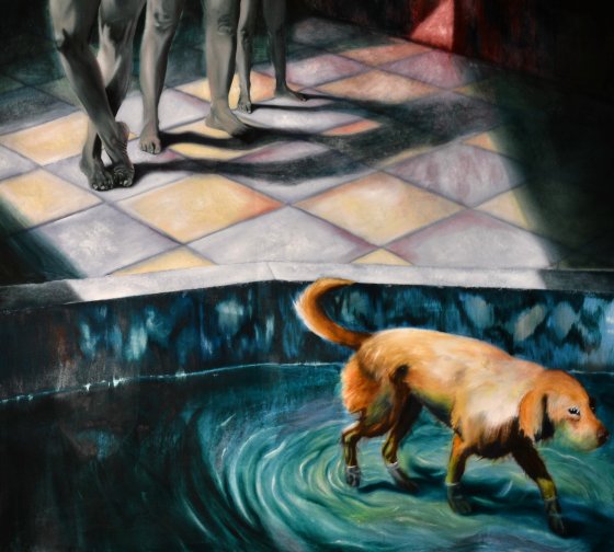 Ma peinture met en scène un chien et les membres d’une même famille dont on ne voit que les jambes et les ombres. L’espace de la piscine se laisse aisément deviner : bassin où marche le chien, dalles illuminées. Cette image nous est apparemment familière.