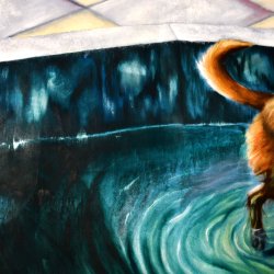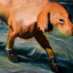 Bien qu’elle soit une figure familière et un motif récurrent de la peinture, l’image du chien renforce l’impression de mystère. Qui est-il ? Ce n’est pas Cerbère, mais plutôt un guide qui nous fait passer de la mélancolie à une douceur espérée.