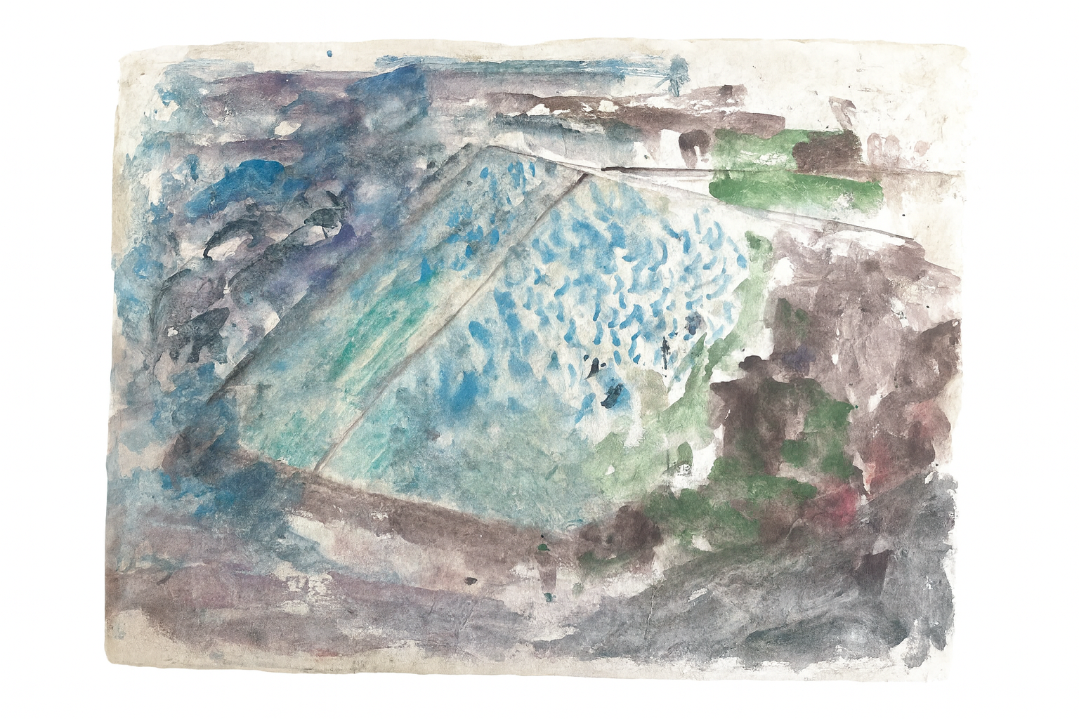 Cette aquarelle sur papier de mĂ»rier prĂ©parĂ© au marbre explore la fragile frontiĂšre entre calme et tempĂȘte. Jây peins une piscine dâeau de mer en Normandie, saisie lors de la houle de la tempĂȘte Eddie. Conçue pour contenir lâocĂ©an, elle disparaĂźt pourtant deux fois par jour sous la marĂ©e, rappelant sa vocation Ă©phĂ©mĂšre. Ce lieu domestiquĂ© se brouille alors, le vent soulevant la surface, effaçant la limite entre lâeau tranquille du bassin et la mer en furie qui cherche Ă lâengloutir. Ă cet instant, la piscine cesse dâĂȘtre refuge pour devenir passage, seuil mouvant entre repos et chaos, maĂźtrise et dĂ©bordement. Jâai choisi lâaquarelle car son mĂ©dium est lâeau elle-mĂȘme : ses transparences et ses flux imprĂ©visibles font Ă©cho au sujet quâelle reprĂ©sente. Elle saisit avec fragilitĂ©, et pour simple outil de lâeau et du papier, lâintensitĂ© fugitive dâun moment vouĂ© Ă disparaĂźtre.
